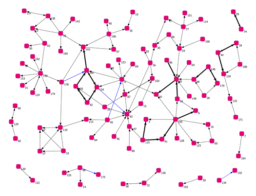 Nota: De pijlen wijzen van slachtoffers naar daders van pesten. Pijlen met stippellijn duiden op klassiek pesten, blauwe pijlen wijzen op cyberpesten, en vette pijlen wijzen op klassiek pesten én cyberpesten.