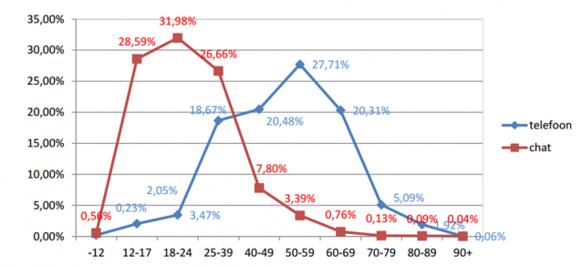 Grafiek: Percentage oproepers via chat en telefoon bij Tele-Onthaal per leeftijdscategorie
