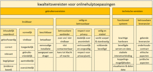 Hieronder brengen we in een overzicht de kwaliteitscriteria samen. Daarbij onderscheiden we gebruikersvereisten en technische vereisten. Met ‘gebruikers’ bedoelen we zowel de cliënten als de hulpverleners.