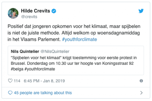 Die term wordt door tegenstanders van de betoging dankbaar gebruikt. Waar ‘jongeren voor het klimaat’ niet direct negatieve gevoelens oproept, doet de term ‘klimaatspijbelaars’ dat duidelijk wel. Want spijbelen is een overtredeing van de rechtsregels, en levert dus veel gemengde gevoelens op: “We vinden dat de jongeren gelijk hebben, maar de manier waarop ze hun ideeën uiten is een probleem.” Minister van Onderwijs Hilde Crevits was één van de eersten die dit aangaf.