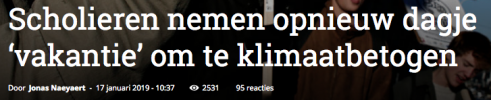 Vandaag (24/01/19) kwamen 35.000 scholieren de straat om te betogen voor een beter klimaatbeleid. Het is al de derde keer op drie weken dat ze dit doen. Het aantal manifestanten groeit elke keer weer. En ze zijn van plan om dit te blijven doen, tot de regering daadwerkelijk actie onderneemt.