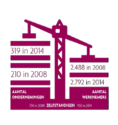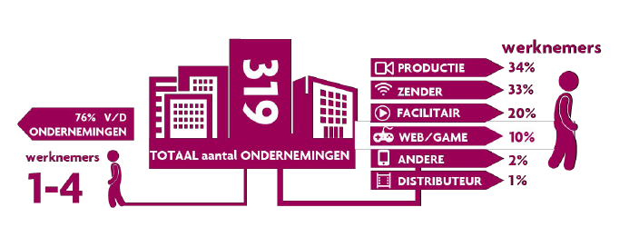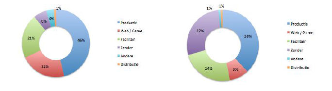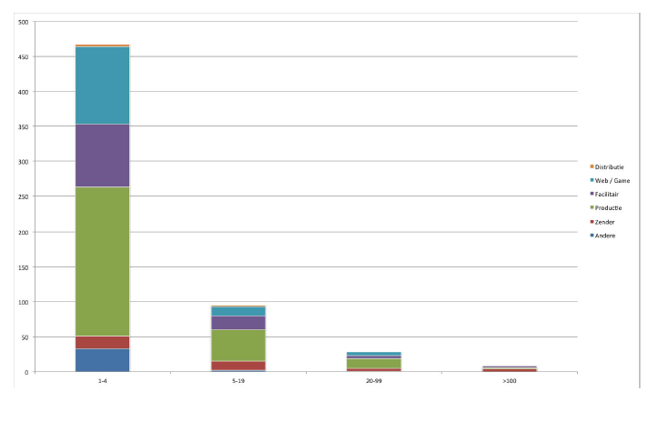 Opvallend hier is de stijging van het aantal bedrijven dat we clusteren onder ‘web-bedrijven’. Dit zijn voornamelijk bedrijven die zich richten op de productie van de nieuwe mediaplatformen (internet, game, apps, etc.).