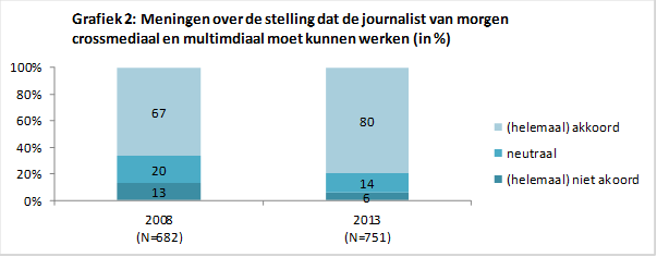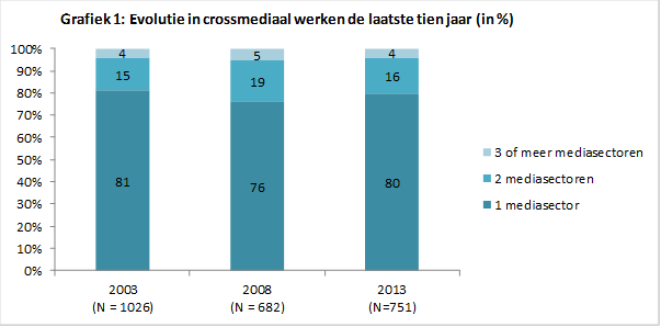 - Het percentage journalisten dat voor meerdere traditionele mediasectoren werkt, is gedaald van 24% in 2008 naar 20% in 2013.
