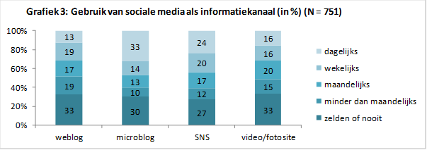 Sociale media bieden journalisten een aantal nieuwe tools voor het verspreiden en verzamelen van informatie. Uit de data blijkt dat Vlaamse beroepsjournalisten meer beroep doen op sociale media voor het verzamelen van nieuws. Onderstaande grafiek toont dat een beperkt percentage van de journalisten dagelijks beroep doet op microblogs (33%) en sociaalnetwerksites (24%). Video- en fotosites (16%) en weblogs (13%) zijn iets minder populair. Hoewel een gering aandeel van de respondenten regelmatig gebruik maakt van bepaalde sociale media om informatie te verzamelen, stellen we ook vast dat een ruim percentage van de respondenten aangeeft dat ze zelden of nooit gebruikmaken van weblogs (33%), microblogs (30%), sociaalnetwerksites (27%) en video- en fotosites (33%) om informatie te verzamelen.