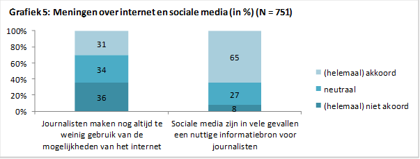 Hoe staan journalisten zelf ten opzichte van internet en sociale media? Om deze vraag te beantwoorden legden we de respondenten twee stellingen voor. De grafiek op de volgende pagina toont dat de meerderheid (65%) van de respondenten meent dat sociale media in vele gevallen een nuttige informatiebron kunnen zijn voor journalisten (tweede balk). Wat opvalt is dat het percentage dat akkoord gaat met deze stelling daalt naarmate de leeftijd toeneemt (van 78% in de jongste categorie naar 44% in de oudste categorie). Bovendien stellen we vast dat ruim drie op de tien respondenten (31%) ervan overtuigd zijn dat journalisten nog altijd te weinig gebruik maken van de mogelijkheden van het internet (eerste balk). Dat percentage ligt opvallend hoger dan vijf jaar geleden (24%).