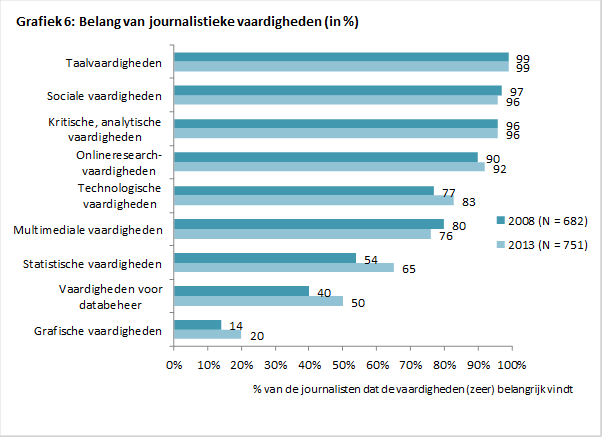 Wanneer we kijken naar een aantal meer specifieke vaardigheden, stellen we wel enkele opmerkelijke verschuivingen vast. Vooral technische vaardigheden, statistische competenties, vaardigheden voor databeheer en grafische vaardigheden worden de laatste jaren steeds belangrijker ingeschat door journalisten. Verrassend is dat het belang dat journalisten hechten aan multimediale vaardigheden, de laatste vijf jaar licht gedaald is.