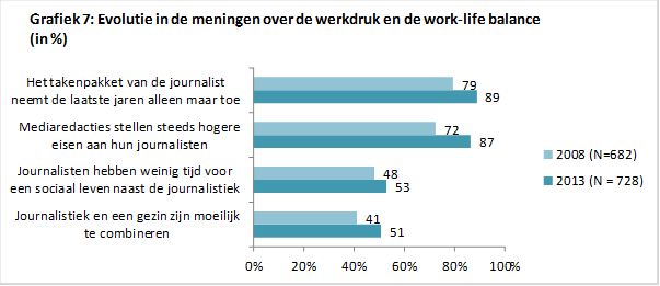 Het aandeel van de respondenten dat ervan overtuigd is dat journalistiek en een gezin moeilijk te combineren zijn en dat journalisten weinig tijd hebben voor een sociaal leven is de laatste vijf jaar gestegen