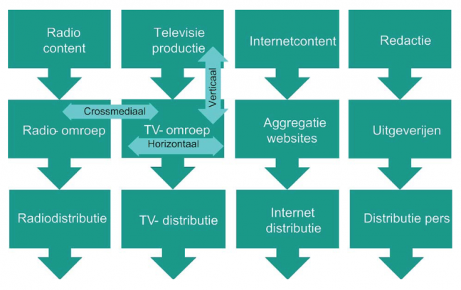 - Verticale concentratie geeft aan dat een aantal verschillende opeenvolgende schakels in handen zijn van eenzelfde speler (bv. een lokale radio-omroep maakt al zijn radioprogramma’s zelf en is ook eigenaar van de zendinstallatie). Praktijkvoorbeeld: Telenet is actief als kabeldistributeur, maar is ook actief in de productie en aggregatie via zijn participatie bij respectievelijk Woestijnvis en VIER, VIJF en ZES.