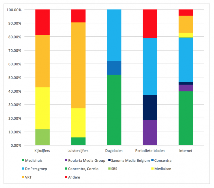 Het Vlaamse aanbod aan klassieke mediaproducten is voor 80 tot 100 procent van de markt in handen van negen mediagroepen. Dit kan een risico inhouden voor de diversiteit van het aanbod.