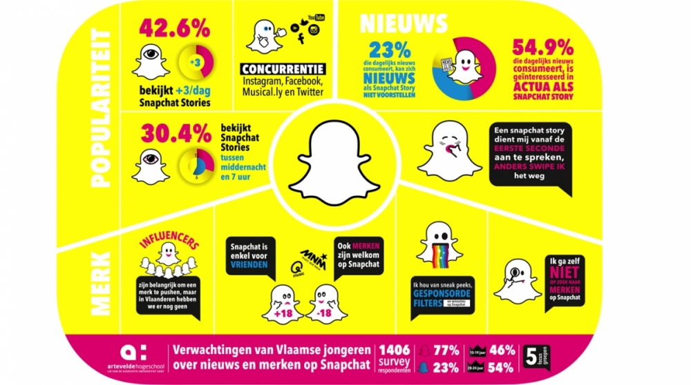Noot: Bovenstaande bevindingen maken deel uit van het onderzoek naar Snapchat als potentieel branding- en nieuwskanaal voor Vlaamse mediabedrijven om jongeren te bereiken. Naast nieuws werd dus ook gefocust op branding en op het gebruik van Snapchat in het algemeen. Deze resultaten werden in bovenstaand artikel niet opgenomen. Bijgevoegde Infographic geeft het volledige onderzoek in een notendop weer.