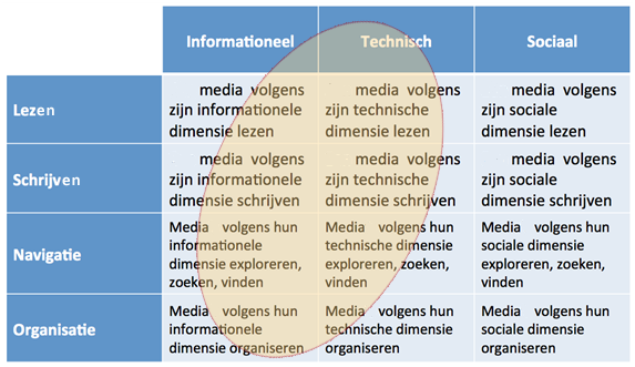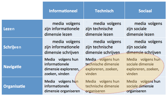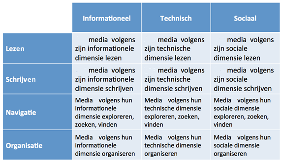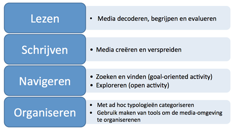 We onderscheiden vier soorten taken met betrekking tot mediageletterdheid. Enerzijds lezen en schrijven, dat is gericht op het ontvangen en produceren van een media-object. En anderzijds, navigeren en organiseren, dat is gericht op het ontvangen en produceren van een verzameling van (gerelateerde) media-objecten.
