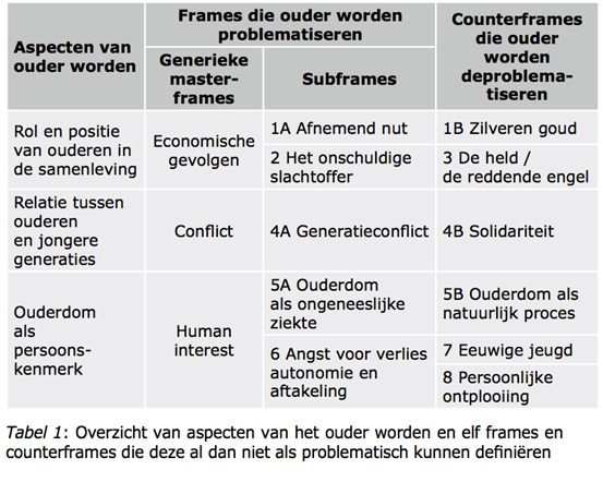 In september 2013 verscheen er bij de Koning Boudewijnstichting een studie over hoe senioren in de media worden geportretteerd: Van ‘over en oud’ tot ‘het zilveren goud’ – Beeldvorming en communicatie over het ouder worden. Professor Baldwin Van Gorp (Instituut voor Mediastudies, KULeuven) onderwierp uiteenlopende mediaproducten – waaronder krantenartikels en reclame – aan een framinganalyse en kwam tot de conclusie dat er 11 verschillende manieren zijn om over ouderen te praten. Hieronder volgt een korte samenvatting.