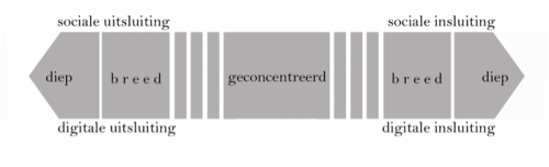 Er is een breder kader nodig om te begrijpen wie digitaal uitgesloten is. Het onderstaande continuüm van digitale ongelijkheden biedt hiertoe een houvast. Het omvat, verdeeld over vijf gradaties, alle mogelijke posities die mensen kunnen innemen tussen volledige uitsluiting en volledige insluiting, in het sociale en in het digitale veld.