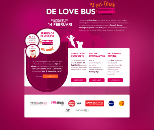 14 februari - op Valentijnsdag - toert Mediawijs.be met de ‘Love Bus’ langs een aantal Vlaamse steden en brengt tips en tricks over online daten via Cupido’s en Cupidon’ts en zorgt voor een profiel make-over voor iedereen die met online daten aan de slag wil. Deelnemers aan de liefdeskwis kunnen coupons winnen voor een half jaar gratis daten op de online datingsite Parship en er worden ook boeken uitgedeeld over de ‘Liefde’. Dit jaar worden singels op Valentijn in de watten gelegd dankzij de ‘Love bus’!