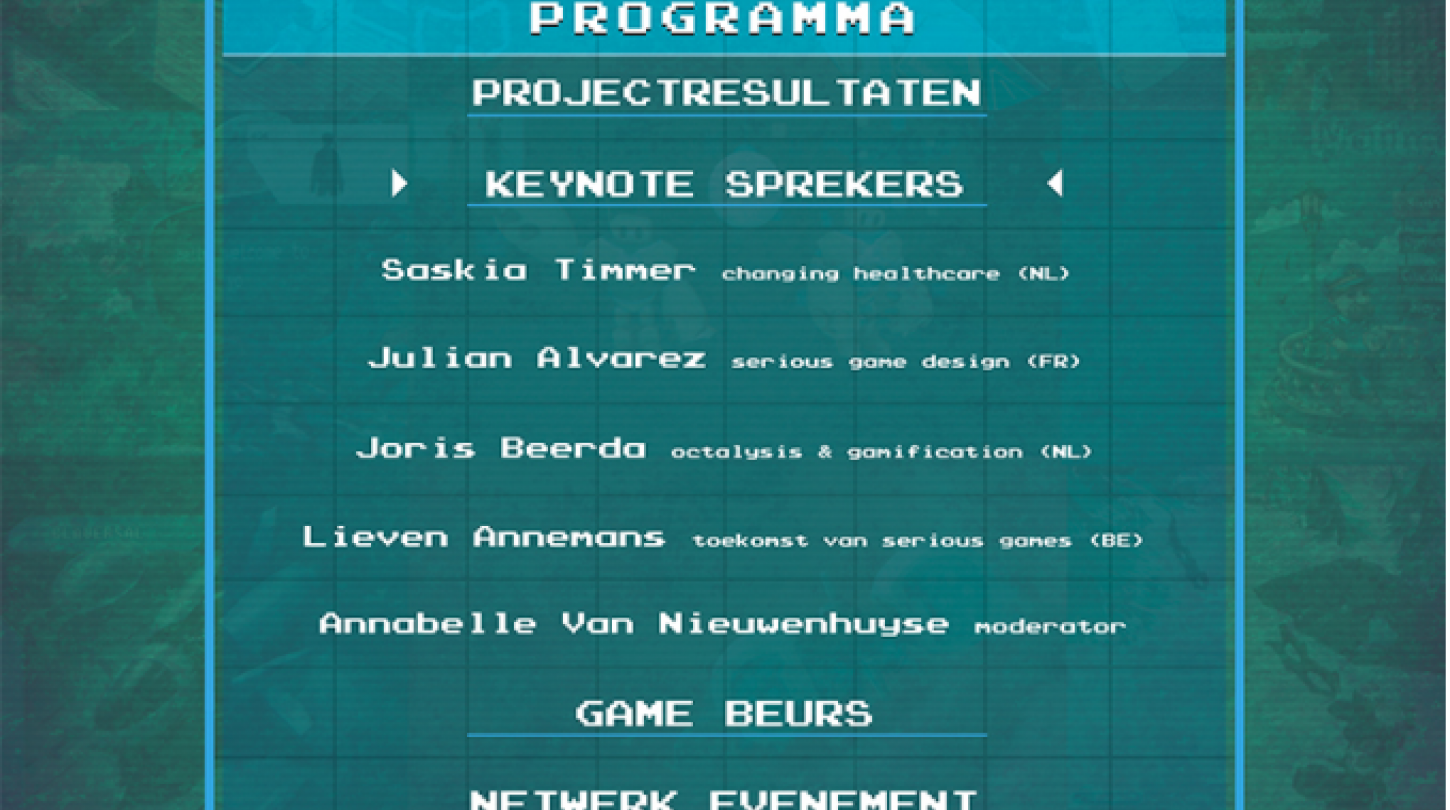 Naast de toegankelijke presentatie van de projectresultaten en de behandelde cases(niet-aangeboren hersenletsel, gezonde levensstijl, problematisch gamegedrag, autisme spectrum stoornis en inflammatoire darmziekten), houden gastsprekers inspirerende talks over de toekomst van serious games in de gezondheidszorg, serious game design en eHealth. Hiervoor wordt beroep gedaan op de expertise van Saskia Timmer, Lieven Annemans, Julian Alvarez en Joris Beerda.