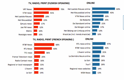 Zo blijkt dat in beide landsdelen in gelijke mate sociale media gebruikt worden voor nieuws, en we met 46% (45%NL/48%FR) op het gemiddelde zitten van alle 26 landen. Kijk je dan weer naar het gebruik van gedrukte media voor nieuws, dan zie je gemiddeld 45% van de Belgen hier beroep op doen, maar is dit wel 50% van de Nederlandstaligen tegenover 38% van de Franstaligen. Print staat dus in Franstalig België duidelijk sterker onder druk van een publiek dat afhaakt dan in Vlaanderen.